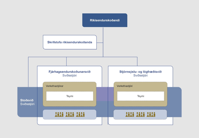 Yfir hvoru fagsviði er sviðsstjóri og undir honum eru sérfræðingar og, eftir atvikum, einn eða fleiri verkefnastjórar. Fagsviðin starfa almennt í teymum og eiga náið samstarf í ýmsum málefnum, bæði til lengri og skemmri tíma. Nokkur teymi starfa þvert á sviðin, s.s. teymi sem annast eftirlit með framkvæmd fjárlaga og laga um opinber fjármál og teymi sem sinnir málefnum tengdum innra eftirliti og innri endurskoðun hjá ríkisaðilum.